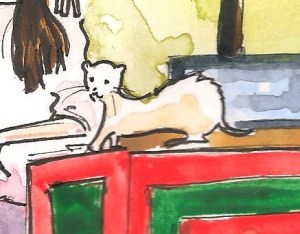 Bethan lives on a narrowboat with her partner, their dog, and their ferret. Everyone was included in this colourful portrait.